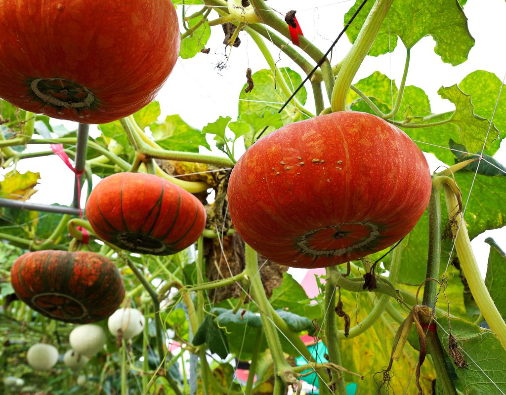 Sprawling pumpkin vines can grow up to 20 feet long. In raised beds it’s a good idea to plant pumpkins near the outer edge where the vines can be trained to run away and the rest of the bed will be left for other plants. Container gardeners should use a 20 or 25 gallon container for pumpkin plants. To maximize the use of space, pumpkin vines are easy to train onto a stout trellis. Where space saving is important, consider growing smaller varieties like pie pumpkins that have a great flavor and color but only grow to about the size of a medium cantaloupe.