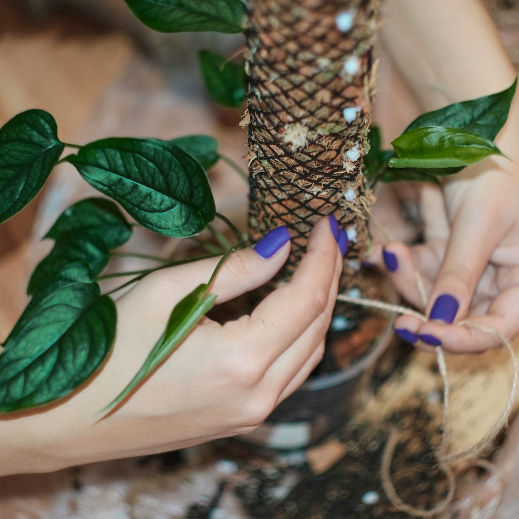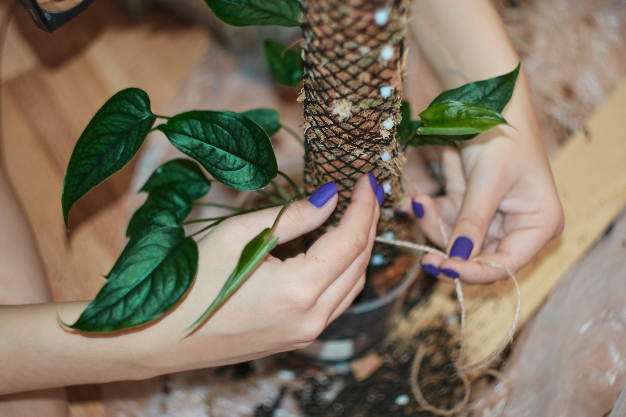 To train your plants to climb a moss pole and produce more greenery and leaves, you must begin by adequately attaching it to the pole. This step is critical to train your plants because they must first link to the stake to promote upward growth and foliage. Plants are triggered to connect directly with the contact of the pole surface, and binding them closely will enable this to occur. There are several ways you can attach your plants to the moss pole.